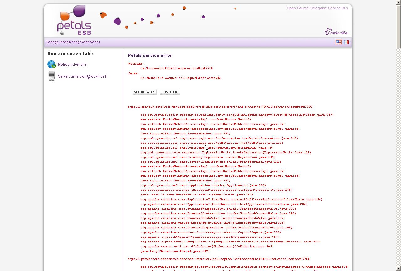 The trace show into the webconsole:org.ow2.opensuit.core.error.NonLocalizedError: [Petals service error] Can't connect to PEtALS server on localhost:7700 org.ow2.petals.tools.webconsole.uibeans.MonitoringUIBean.getExchangeOverview(MonitoringUIBean.java:717) sun.reflect.NativeMethodAccessorImpl.invoke0(Native Method) sun.reflect.NativeMethodAccessorImpl.invoke(NativeMethodAccessorImpl.java:39) sun.reflect.DelegatingMethodAccessorImpl.invoke(DelegatingMethodAccessorImpl.java:25) java.lang.reflect.Method.invoke(Method.java:597) org.ow2.opensuit.cel.impl.tree.impl.ast.AstInvocation.invoke(AstInvocation.java:146) org.ow2.opensuit.cel.impl.tree.impl.ast.AstMethod.invoke(AstMethod.java:136) org.ow2.opensuit.cel.impl.tree.impl.ast.AstEval.invoke(AstEval.java:59) org.ow2.opensuit.core.expression.ExpressionUtils.invokeExpression(ExpressionUtils.java:119) org.ow2.opensuit.xml.base.binding.Expression.invoke(Expression.java:147) org.ow2.opensuit.xml.base.action.DoAndForward.invoke(DoAndForward.java:141) sun.reflect.NativeMethodAccessorImpl.invoke0(Native Method) sun.reflect.NativeMethodAccessorImpl.invoke(NativeMethodAccessorImpl.java:39) sun.reflect.DelegatingMethodAccessorImpl.invoke(DelegatingMethodAccessorImpl.java:25) java.lang.reflect.Method.invoke(Method.java:597) org.ow2.opensuit.xml.base.Application.service(Application.java:514) org.ow2.opensuit.core.impl.j2ee.OpenSuitServlet.service(OpenSuitServlet.java:155) javax.servlet.http.HttpServlet.service(HttpServlet.java:717) org.apache.catalina.core.ApplicationFilterChain.internalDoFilter(ApplicationFilterChain.java:290) org.apache.catalina.core.ApplicationFilterChain.doFilter(ApplicationFilterChain.java:206) org.apache.catalina.core.StandardWrapperValve.invoke(StandardWrapperValve.java:233) org.apache.catalina.core.StandardContextValve.invoke(StandardContextValve.java:191) org.apache.catalina.core.StandardHostValve.invoke(StandardHostValve.java:127) org.apache.catalina.valves.ErrorReportValve.invoke(ErrorReportValve.java:102) org.apache.catalina.core.StandardEngineValve.invoke(StandardEngineValve.java:109) org.apache.catalina.connector.CoyoteAdapter.service(CoyoteAdapter.java:298) org.apache.coyote.http11.Http11Processor.process(Http11Processor.java:857) org.apache.coyote.http11.Http11Protocol$Http11ConnectionHandler.process(Http11Protocol.java:588) org.apache.tomcat.util.net.JIoEndpoint$Worker.run(JIoEndpoint.java:489) java.lang.Thread.run(Thread.java:619) org.ow2.petals.tools.webconsole.services.PetalsServiceException: Can't connect to PEtALS server on localhost:7700 org.ow2.petals.tools.webconsole.services.utils.ConnexionHelper.connectionInstanciator(ConnexionHelper.java:174) org.ow2.petals.tools.webconsole.services.utils.ConnexionHelper.connect(ConnexionHelper.java:88) org.ow2.petals.tools.webconsole.services.monitoring.MonitoringServiceJMXImpl.getRouterMonitorServiceClient(MonitoringServiceJMXImpl.java:294) org.ow2.petals.tools.webconsole.services.monitoring.MonitoringServiceJMXImpl.getExchange(MonitoringServiceJMXImpl.java:71) org.ow2.petals.tools.webconsole.business.MonitoringBBean.getExchange(MonitoringBBean.java:310) org.ow2.petals.tools.webconsole.uibeans.MonitoringUIBean.getExchangeOverview(MonitoringUIBean.java:710) sun.reflect.NativeMethodAccessorImpl.invoke0(Native Method) sun.reflect.NativeMethodAccessorImpl.invoke(NativeMethodAccessorImpl.java:39) sun.reflect.DelegatingMethodAccessorImpl.invoke(DelegatingMethodAccessorImpl.java:25) java.lang.reflect.Method.invoke(Method.java:597) org.ow2.opensuit.cel.impl.tree.impl.ast.AstInvocation.invoke(AstInvocation.java:146) org.ow2.opensuit.cel.impl.tree.impl.ast.AstMethod.invoke(AstMethod.java:136) org.ow2.opensuit.cel.impl.tree.impl.ast.AstEval.invoke(AstEval.java:59) org.ow2.opensuit.core.expression.ExpressionUtils.invokeExpression(ExpressionUtils.java:119) org.ow2.opensuit.xml.base.binding.Expression.invoke(Expression.java:147) org.ow2.opensuit.xml.base.action.DoAndForward.invoke(DoAndForward.java:141) sun.reflect.NativeMethodAccessorImpl.invoke0(Native Method) sun.reflect.NativeMethodAccessorImpl.invoke(NativeMethodAccessorImpl.java:39) sun.reflect.DelegatingMethodAccessorImpl.invoke(DelegatingMethodAccessorImpl.java:25) java.lang.reflect.Method.invoke(Method.java:597) org.ow2.opensuit.xml.base.Application.service(Application.java:514) org.ow2.opensuit.core.impl.j2ee.OpenSuitServlet.service(OpenSuitServlet.java:155) javax.servlet.http.HttpServlet.service(HttpServlet.java:717) org.apache.catalina.core.ApplicationFilterChain.internalDoFilter(ApplicationFilterChain.java:290) org.apache.catalina.core.ApplicationFilterChain.doFilter(ApplicationFilterChain.java:206) org.apache.catalina.core.StandardWrapperValve.invoke(StandardWrapperValve.java:233) org.apache.catalina.core.StandardContextValve.invoke(StandardContextValve.java:191) org.apache.catalina.core.StandardHostValve.invoke(StandardHostValve.java:127) org.apache.catalina.valves.ErrorReportValve.invoke(ErrorReportValve.java:102) org.apache.catalina.core.StandardEngineValve.invoke(StandardEngineValve.java:109) org.apache.catalina.connector.CoyoteAdapter.service(CoyoteAdapter.java:298) org.apache.coyote.http11.Http11Processor.process(Http11Processor.java:857) org.apache.coyote.http11.Http11Protocol$Http11ConnectionHandler.process(Http11Protocol.java:588) org.apache.tomcat.util.net.JIoEndpoint$Worker.run(JIoEndpoint.java:489) java.lang.Thread.run(Thread.java:619) org.ow2.petals.jmx.exception.ConnectionErrorException: Can not connect using URI : service:jmx:rmi:///jndi/rmi://localhost:7700/jmxRmiConnector with petals/petals org.ow2.petals.jmx.JMXConnection.<init>(JMXConnection.java:114) org.ow2.petals.jmx.JMXClient.<init>(JMXClient.java:72) org.ow2.petals.tools.webconsole.services.utils.ConnexionHelper.connectionInstanciator(ConnexionHelper.java:162) org.ow2.petals.tools.webconsole.services.utils.ConnexionHelper.connect(ConnexionHelper.java:88) org.ow2.petals.tools.webconsole.services.monitoring.MonitoringServiceJMXImpl.getRouterMonitorServi