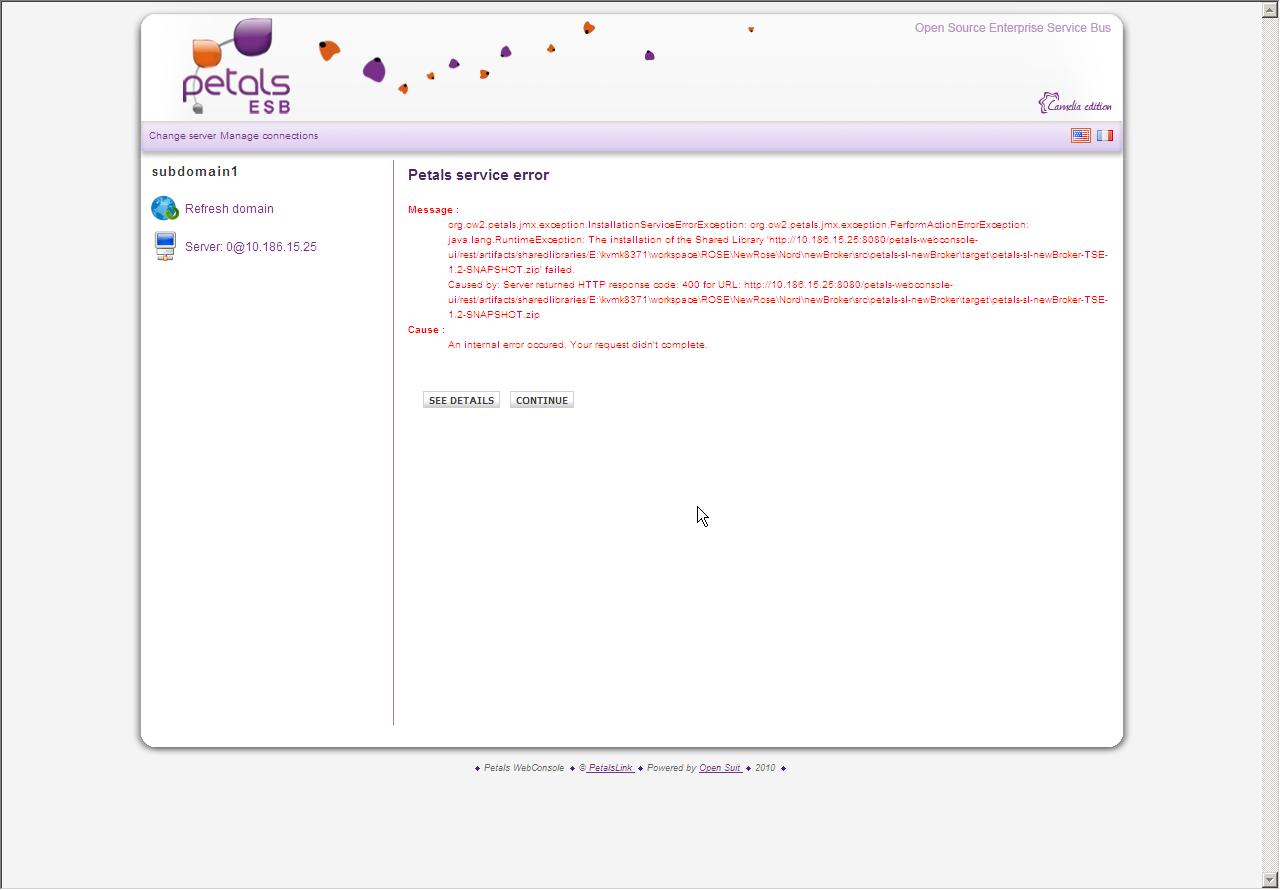 [Petals.JBI-Management.InstallationServiceImpl]-SEVERE 2011-02-15 09:13:12,649 Unable to install the shared library at location 'http:java.lang.Exception: The installation of the Shared Library 'http: at org.ow2.petals.jbi.management.installation.InstallationServiceImpl.installSharedLibrary(InstallationServiceImpl.java:226)
